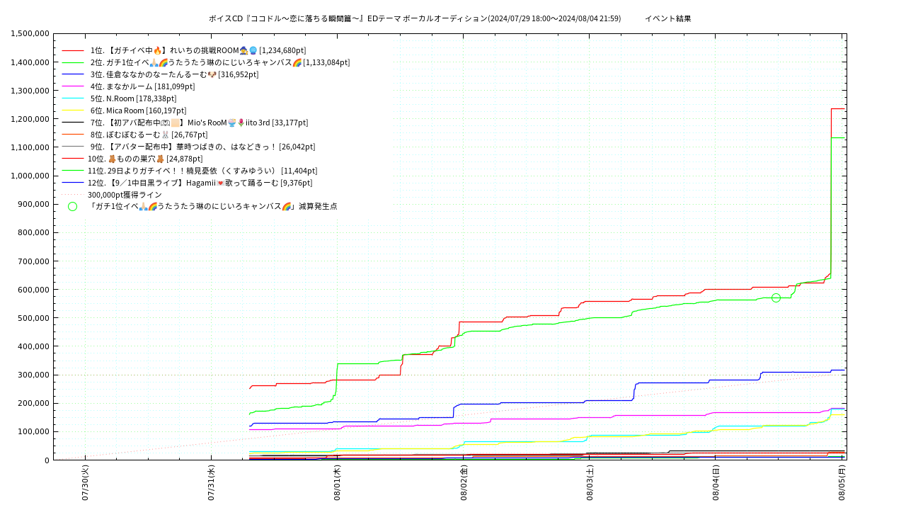 イベント初期にポイントが伸びたルームは、凡例とグラフが重なって見づらい事もありますが、時間が経って縦軸の最大値が大きくなれば大抵は解消するので、どうか寛大なお心で目を瞑って下さい m(__)m